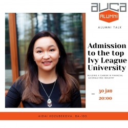 We all understand there is too much Zoom in your everyday lives these days. So, we launched Alumni Talks in a new format on social media pages. Our first speaker Aidai Kozubekova, AUCA alumna 2009, MBA- Tuck School of Business at Dartmouth on January 30, 2021 shared her experience in applying to the Ivy League University, and her career path. She pointed out AUCA network connections appeared and assisted her on several occasions. We thank Aidai for her generous donation of 40,350 soms towards the Alumni Fund.