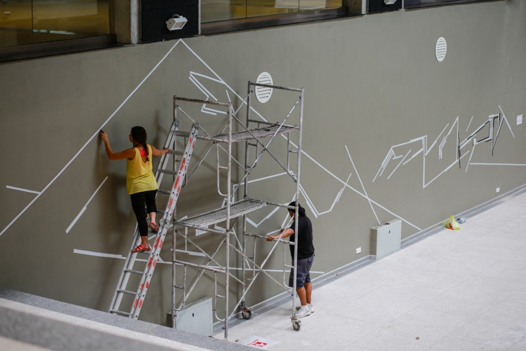 All the artists of the Artystan project have a lot of ideas. And as for myself, I am interested in taking some of the chee technique, the silk, the actual fabric. Here you see these dots, these white circular holes, which lead to other parts of the building. There are similar dots on the fourth floor, so I thought that it would be interesting to make a connection between what is drawn here and something that is going to be upstairs. And hopefully, the final version of this art work will be done next summer, but we don’t know yet.