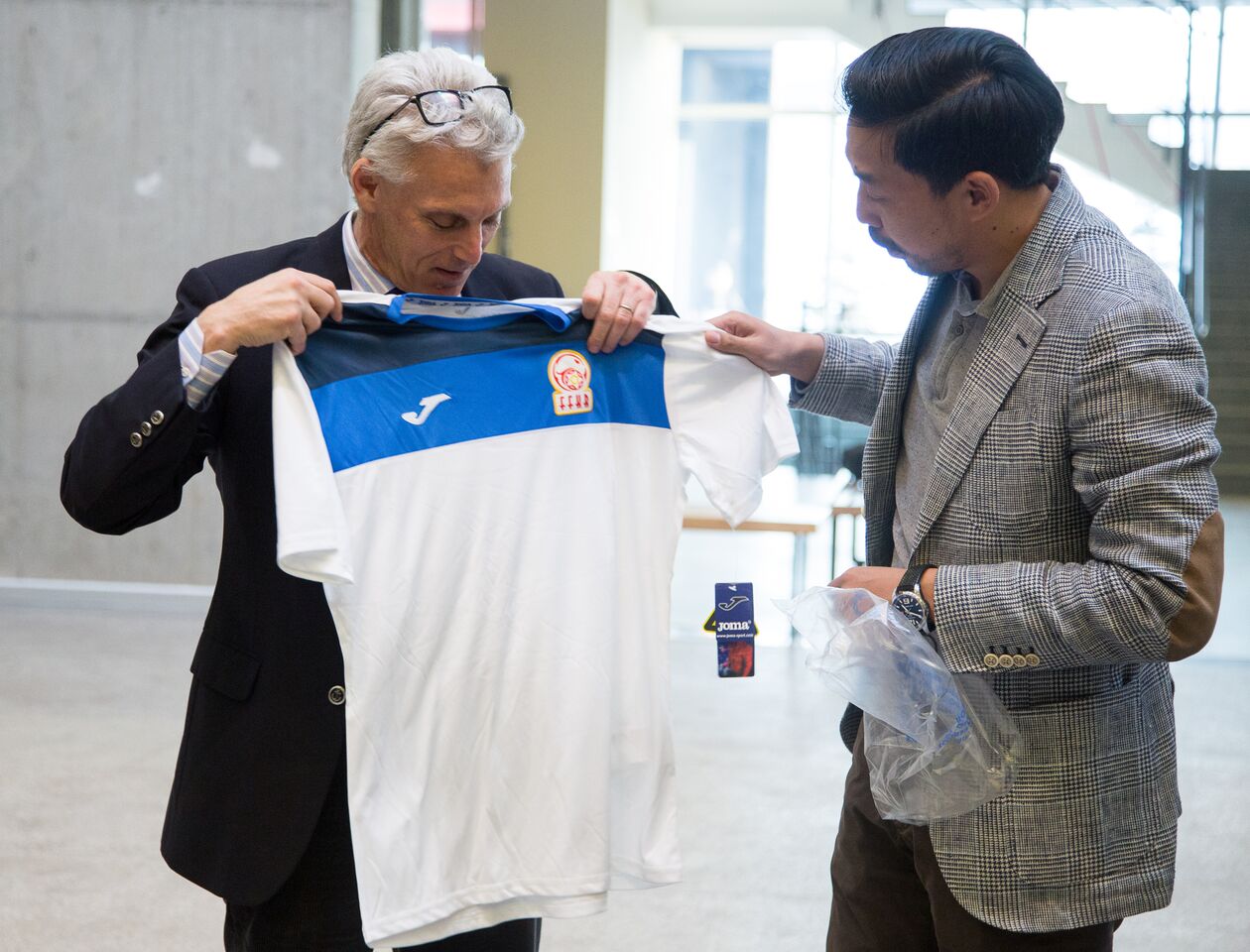 The presidents exchanged presents: Sultanov presented President Wachtel with a football scarf and jersey from Kyrgyzstan’s national football team, among other keepsakes; in return, President Wachtel gave Sultanov an AUCA hoodie and other AUCA memorabilia.