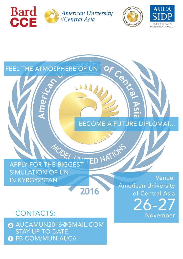 On November 26-27, the Student Senate of the American University of Central Asia (AUCA) in collaboration with Bard College (USA) is organizing a Model United Nations Conference for university students. AUCA is honored to have the opportunity to guide future leaders on the path of integration, diplomacy, and communication.