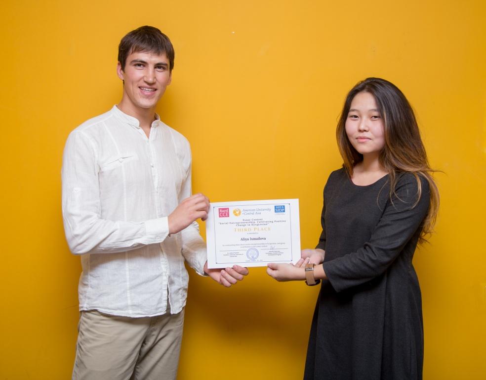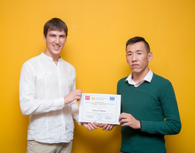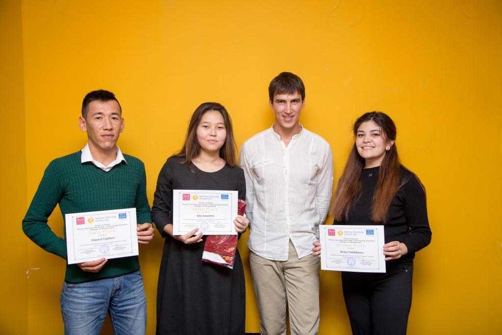 On October 28th, 2016, AUCA held an award ceremony for winners of the “Social Entrepreneurship. Cultivating Positive Change in Kyrgyzstan” essay competition. AUCA’s Students Initiative Development Program (SIDP) organized the competition, coordinating a jury of AUCA and UCA (University of Central Asia) professors. Ten students submitted their essays and three won prizes. Competition winners received: $100 for 1st place, $50 for second place, and an AUCA-branded USB flash drive and T-shirt for third place.