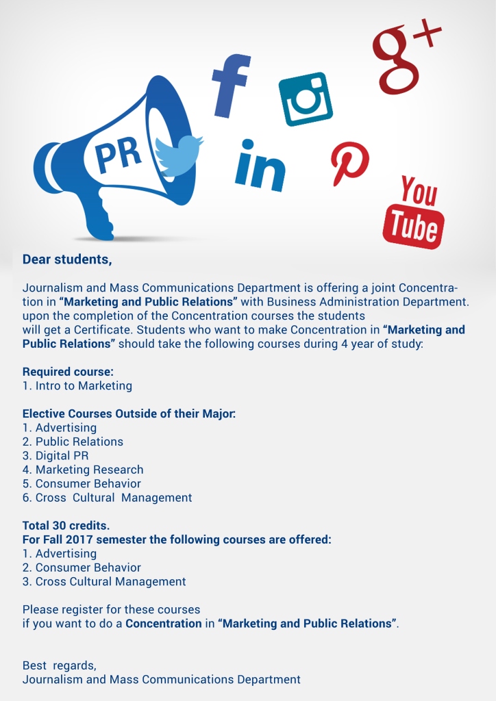the joint Concentration in "Marketing and Public Relations» with Business Administration Department. upon the completion of the Concentration courses the students will get a Certificate.
