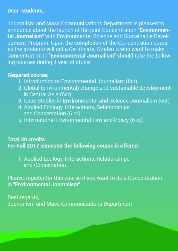 Journalism and Mass Communications Department is pleased to announce about the launch of the joint Concentration "Environmental Journalism" with Environmental Science and Sustainable Development Program. Upon the completion of the Concentration courses the students will get a Certificate;