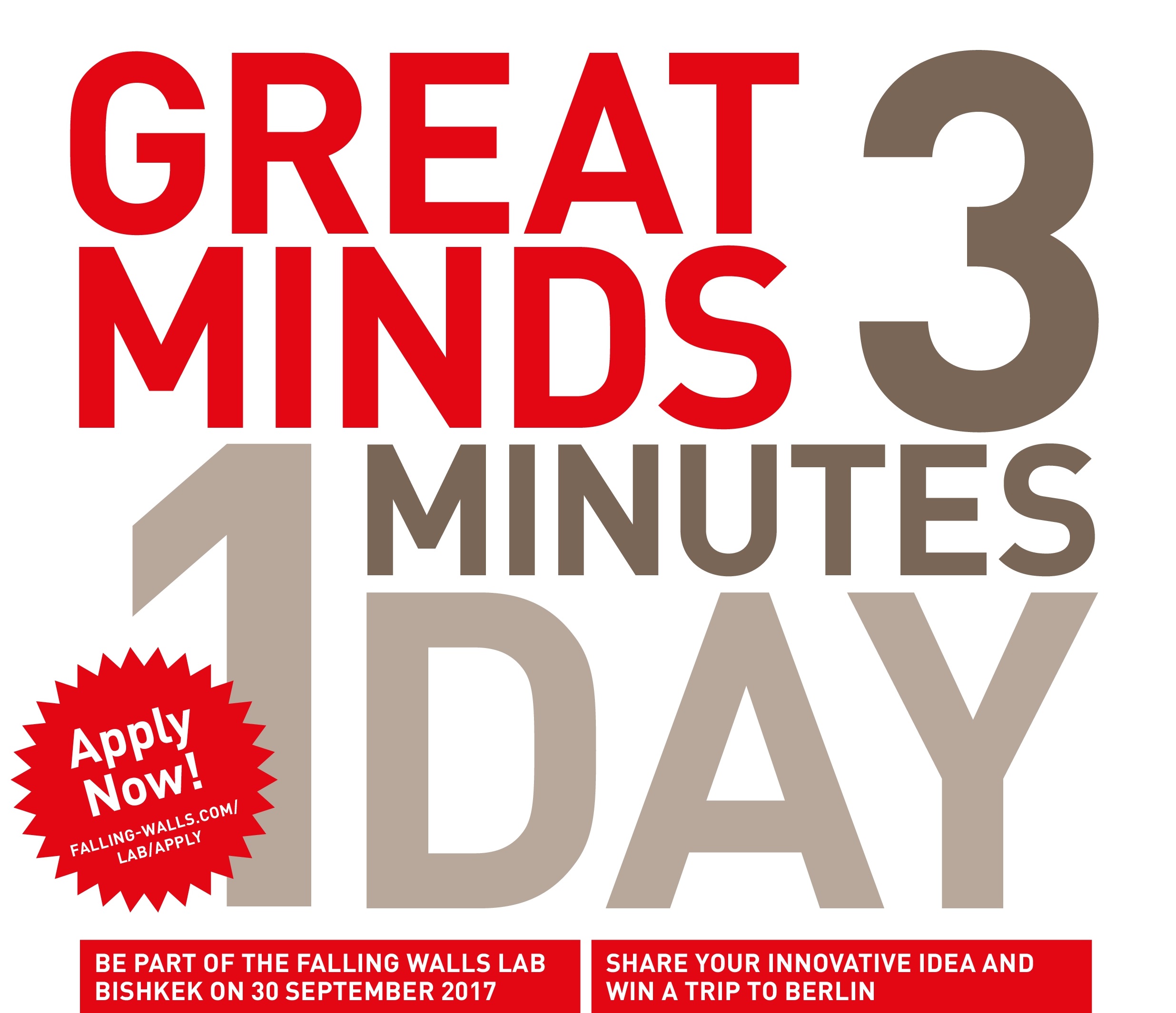 On the 30th of September 2017 the DAAD Bishkek in cooperation with the AUCA and the German Embassy Bishkek organize the Falling Walls Lab Bishkek. You can present your research project, business plan or social initiative - in just three minutes! We are looking for ideas from all fields!