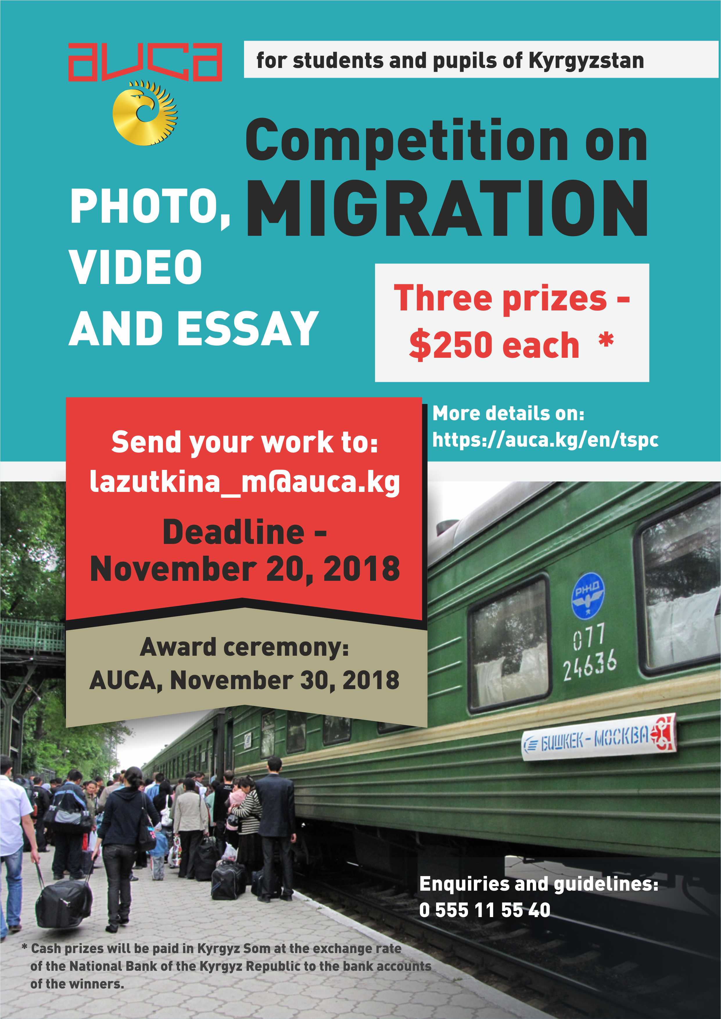 TSPC AUCA (https://auca.kg/ru/tspc/) is an innovative, non-profit analytical organization working in the field of research, analysis, development of sound and effective approaches to solving the most pressing problems of public life in the countries and communities of Central Asia.TSPC AUCA implements projects on such topics as good governance, environmental protection and sustainable development, promotion of human rights, migration management.The competition for the best photo, video and essay on migration is held within the framework of the TSPC AUCA project “Creating a favorable environment in the Kyrgyz Republic for developing effective migration policy: promoting capacity development of state migration authorities and initiating education in the field of migration in the Kyrgyz Republic”.