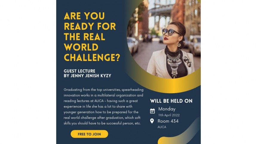 In fact, this is the title of our first guest lecture. Jenny Jeniish kyzy is going to answer this question during the lecture, on April, 11.She received her undergraduate degree at AUCA, and continued her masters at Columbia University in the City of New York and also at Lee Kuantans Yew School of Public Policy, Singapore. Jenny is spearheading innovation works in a multilateral organization and reading lectures at AUCA. We believe, having such a great experience in life she has a lot to share with younger generation how to be prepared for the real world challenge after graduation, which soft skills you should have to be successful person, etc.