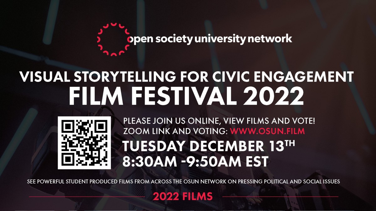 The OSUN "Visual Storytelling for Civic Engagement" course invites all network members to attend a virtual film festival premiering 19 student-made videos from across the network on Tuesday, December 13. The screening will be followed by online voting for a number of awards, such as: 'Cinematography,' 'People’s Choice,' 'Environmental Stewardship,' and more. Students have been working with award winning filmmakers Adam Stepan, Nurzhamal Karamoldoeva, Dina Hossain, and Julia Titowa to create enlightening civic engagement documentary case studies from across the globe.
