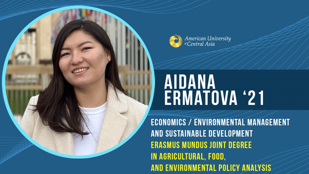 Aidana Ermatova graduated from AUCA in 2021 with a double degree in Environmental Management and Sustainable development and Economics. Upon graduation, Aidana applied for the Erasmus Mundus Joint Masters scholarship and is currently pursuing her master’s degree at the University of Bonn.