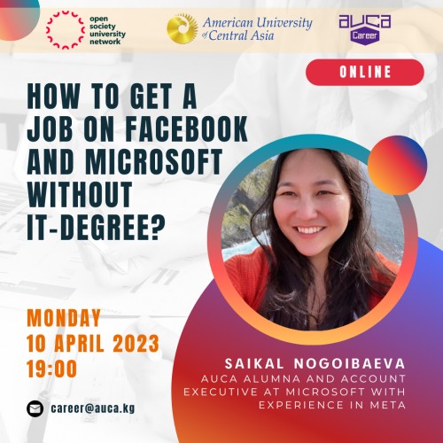 Have you dreamed of getting into an IT giant company, but think you don't have relevant education? You have a great chance to find out how to do it during an online guest lecture led by Account Executive of Microsoft Saikal Nogoibaeva, an AUCA ICP-109 graduate.