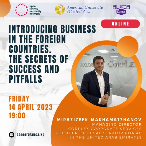 Are you thinking of opening business and don’t know what are the first steps? Then this session is for you. We are pleased to announce an online guest lecture with AUCA Alumnus Mirazizbek Makhamatzhanov (IBL '10) "Introducing business in the foreign countries: the Secrets of Success and Pitfalls''.