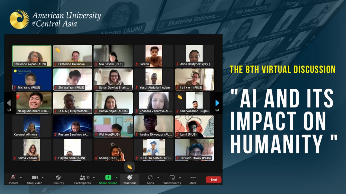 The goal of the international online event was to evolve students' leadership, critical thinking, and communication skills. With the help of the Zoom platform, the event got together about forty participants. The discussion was hosted by Karomatkhon Alimova (AUCA), Zhanara Zamirova (AUCA), and Yusuf Abdullahi (AUN), who were shy at the beginning but were able to overcome the barrier and keep on leading the discussion. The peculiarity of the 8th Virtual Discussion was that it was led both in oral and written forms. That is to say, Zhanara Zamirova asked students questions and gave comments in oral form, and Karomat Alimova used the chat box to encourage "silent" students to post their opinions on the topic via the chat box. The online event consisted of General and Breakout Room Discussions. Out of 7 topics offered by students for Breakout Rooms, the most popular ones turned out to be Scientific evidence that can no longer be trusted, People with tattoos should not be stigmatized, and Feminism is contextual as it is experienced differently everywhere. Since there were so many participants who wanted to express their opinions not only in written form but in oral one as well, the organizers had to open an additional break-out room dedicated to the topic of the General Discussion so that students could continue to talk about AI and its impact on humanity. It is worth mentioning that the outcomes of the 8th virtual discussion will be reflected in student research papers, video projects, and articles.