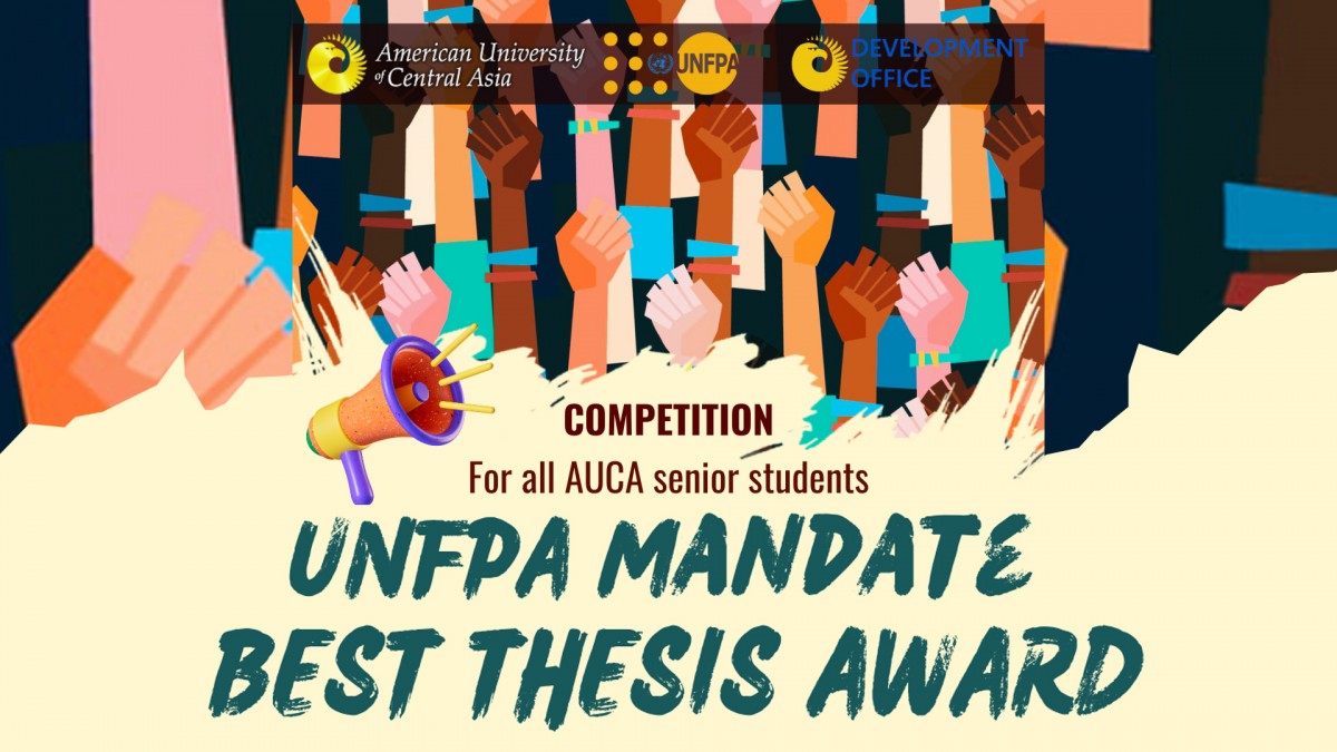 UNFPA Kyrgyzstan invites you to participate in an initiative to support youth in research activities in the sphere of UNFPA mandate. This initiative became possible thanks to the cooperation between the AUCA Development Office and the UNFPA. To implement this initiative, a competition is announced for writing the Best Thesis among AUCA undergraduate senior students. 3 winners will be announced, who will be awarded with the UNFPA Mandate Best Thesis Award.