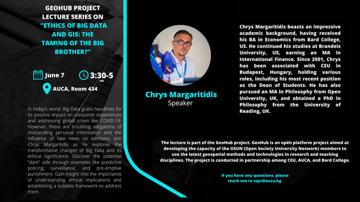 The lecture is part of the GeoHub project. GeoHub is an open platform project aimed at developing the capacity of the OSUN (Open Society University Network) members to use the latest geospatial methods and technologies in research and teaching disciplines. The project is conducted in partnership with CEU, AUCA, and Bard College.