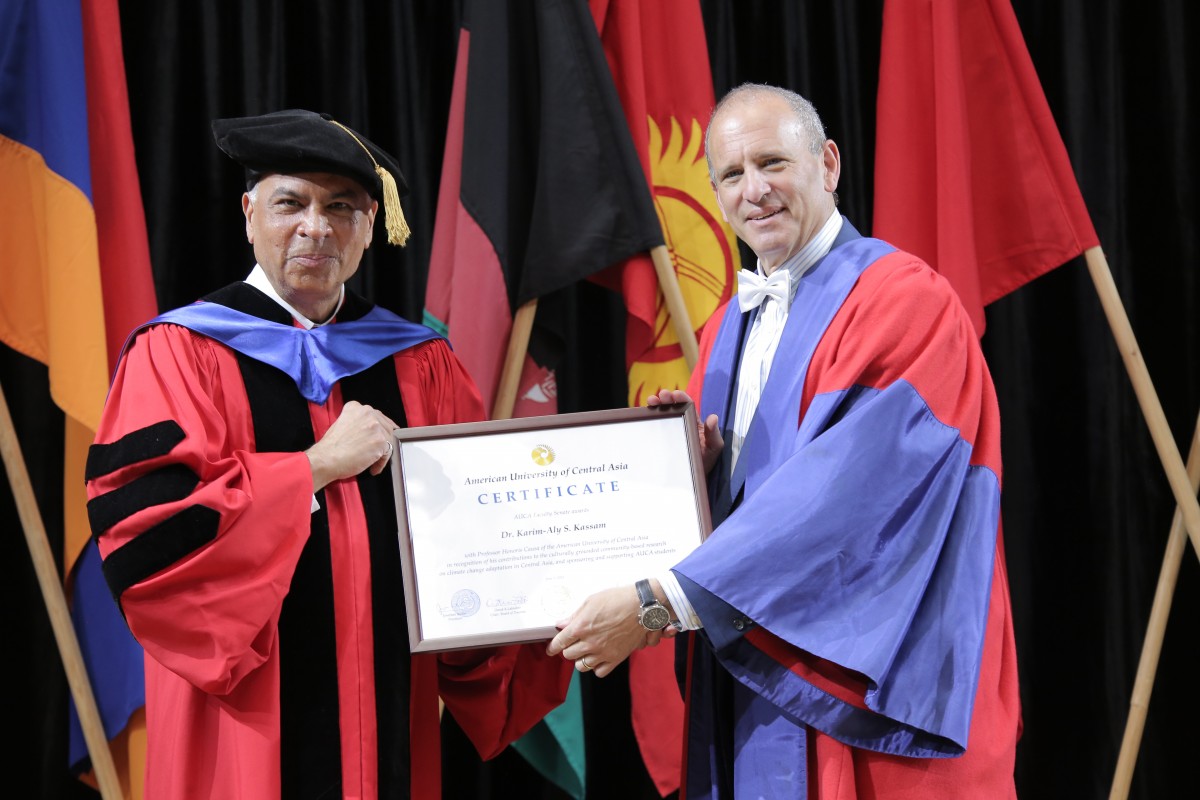 On June 3, 2023, AUCA Faculty Senate awarded Commencement speaker Dr Karim-Aly S. Kassam with Professor Honoris Causa of the American University of Central Asia in recognition of his contributions to the culturally grounded community-based research on climate change adaptation in Central Asia and sponsoring and supporting AUCA students.