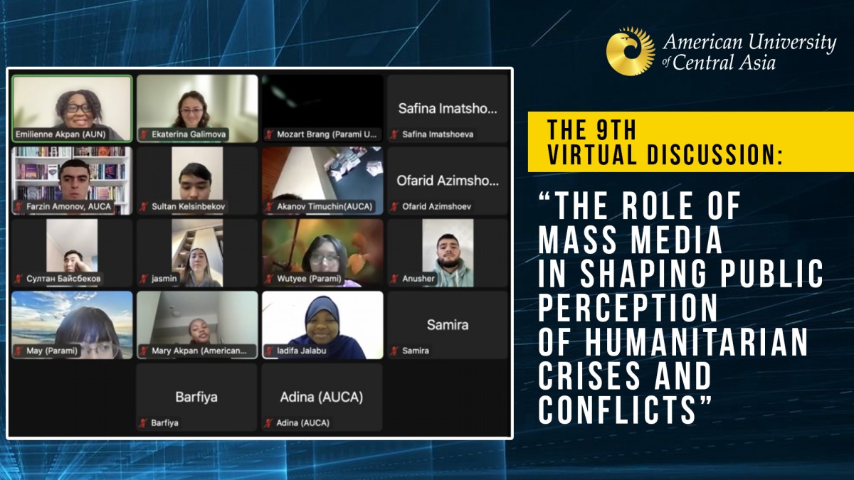 On November 25, 2023, students from American Universities of Nigeria, Myanmar, and Central Asia met each other via Zoom to discuss The Role of Mass Media in Shaping Public Perception of Humanitarian Crises and Conflicts. The 9th Virtual Inter-University Discussion was conducted within the framework of the Civic Engagement Project called Crossing Borders Through Social Media and Dialogue initiated by Ekaterina Galimova (GenEd, FYS, and SYS programs AUCA) and Emilienne Akpan (AUN) in 2019.