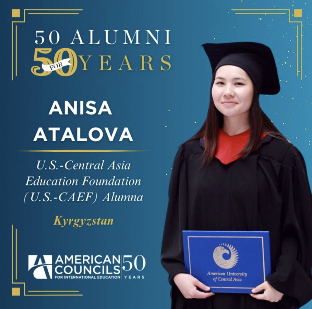 Dear AUCA community! We are thrilled to share with you great news! Our alumna, Anisa Atalova, from the class of 2016, has been selected from a pool of 100,000 American Council alums representing 148 countries as part of the prestigious "50 Alumni for 50 Years" initiative!