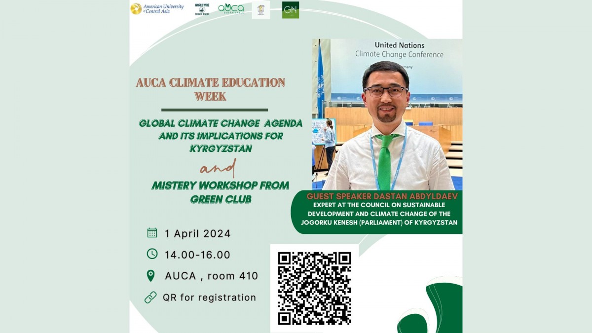 Workshop: "Global Climate Change Agenda and its Implications for Kyrgyzstan". We are thrilled to announce the inaugural event of the AUCA Climate Education Week, featuring distinguished guest speaker Dastan Abdyldaev. Mr. Abdyldaev brings with him nearly two decades of invaluable experience and expertise in policymaking, climate finance, diplomacy, and sustainable development, particularly within the context of Kyrgyzstan.