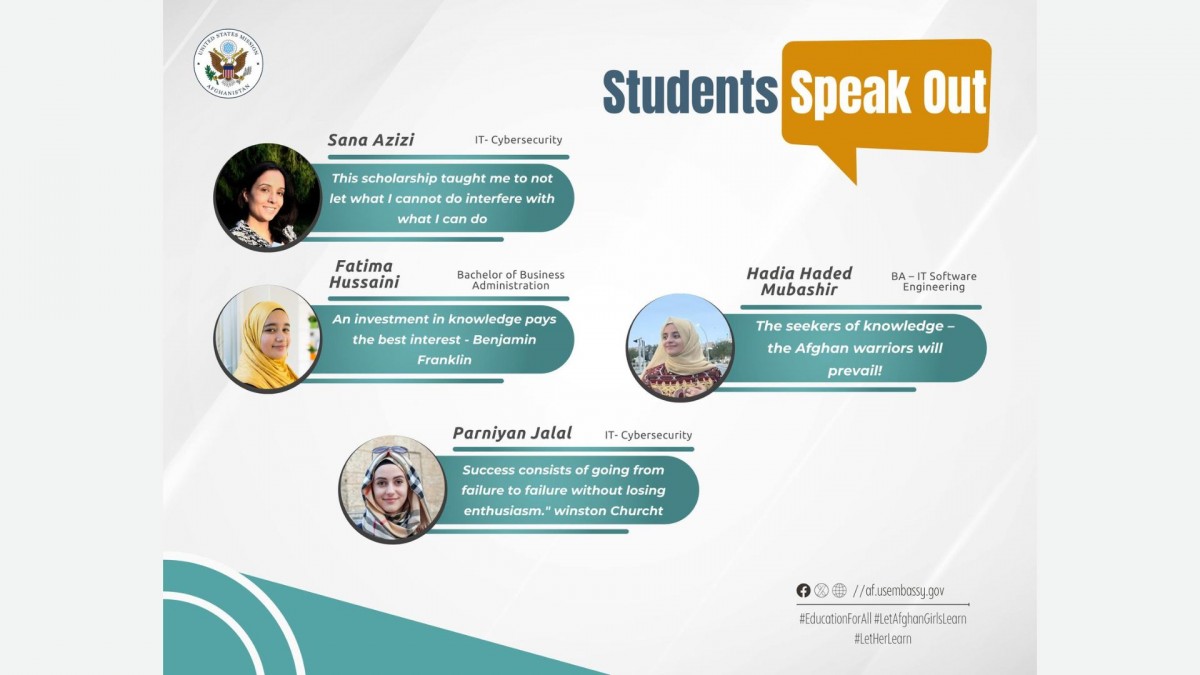 Hear from our inspiring Afghan students, Sana Azizi, Fatima Hussaini, Hadia Haded Mubashir, and Parniyan Jalal, as they share their journeys and struggles. Their voices highlight the importance of education and resilience.