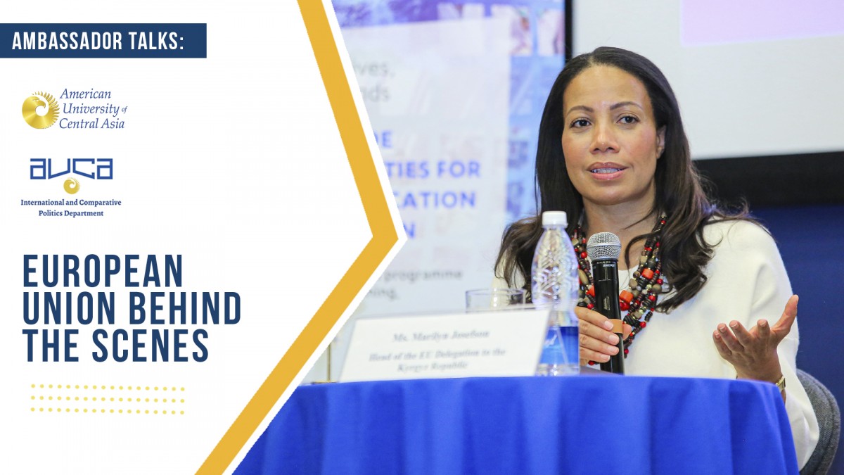 Ambassador Josefson then took the audience “behind the scenes” of EU operations, explaining the union’s mission and longstanding commitment to Kyrgyzstan. Addressing a student question about the EU’s role in the country, she provided an overview of the EU’s foreign policy, which focuses on building interconnected economic systems and fostering cooperative relations with partner countries. She also explained the responsibilities of her role as Ambassador, including overseeing the EU’s cooperation programs in Kyrgyzstan.