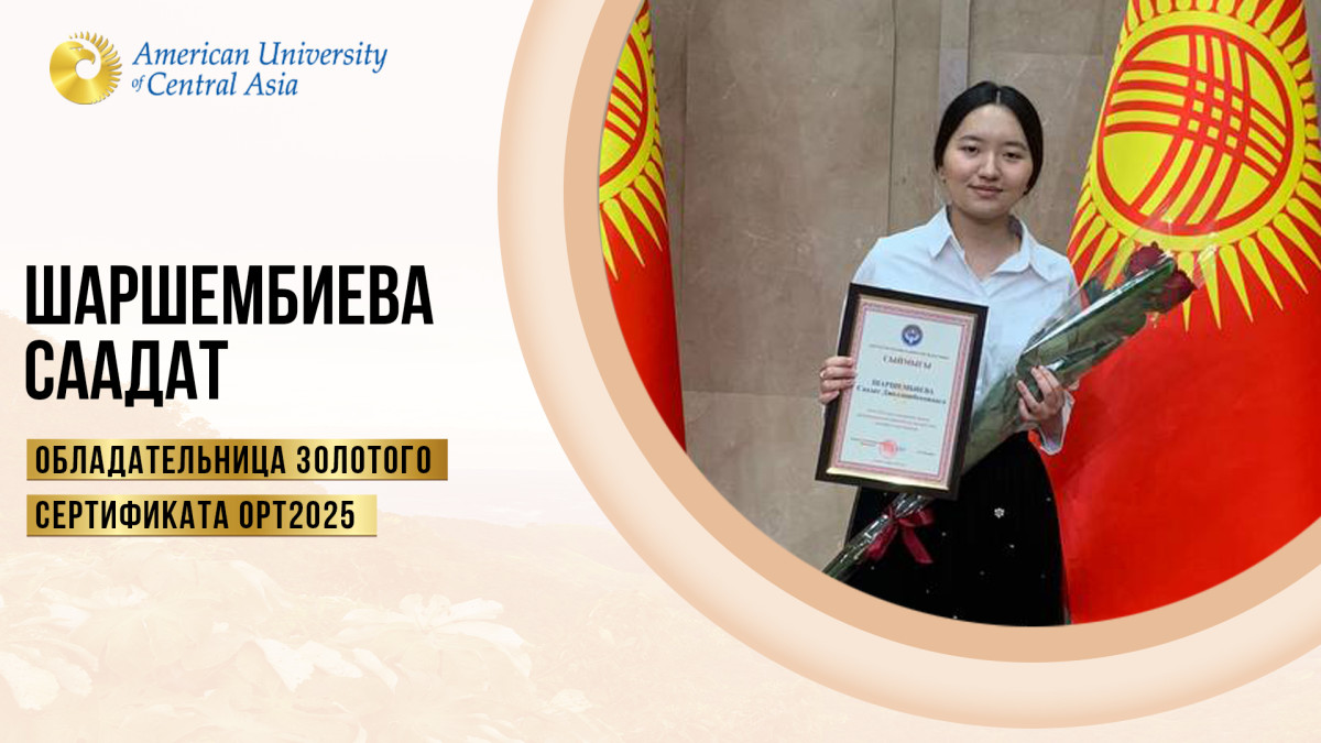 Здравствуйте! Меня зовут Шаршембиева Саадат, мне 17 лет. В этом году я окончила СОШ КРСУ и стала одним из обладателей Золотого Сертификата ОРТ, набрав 232 балла. Сейчас начинаю учёбу в АУЦА по направлению «Экономика».