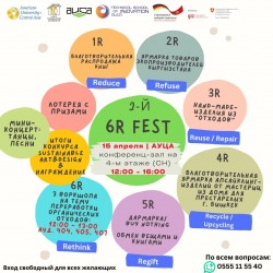 15 апреля в Американском университете в Центральной Азии пройдет 2-й по счету 6R Fest – фестиваль, посвященный управлению отходами в повседневной жизни, под девизом «Об отходах – интересно и полезно».