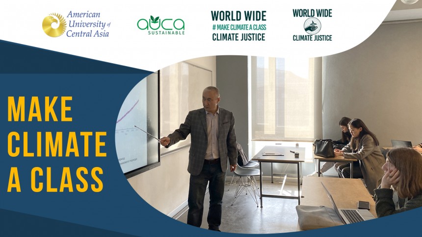A few examples of AUCA faculty Making Climate a Class are: professor from Environmental Sustainability and Climate Science department Mairambek Nurgaziev conducted a Climate Change class in his Food Security, Nutrition and Sustainable Development course for his students, where the climate change concept with its local and global solutions in the context of food security was discussed. Another example is professor Venera Urbaeva from the International and Business Law Department, in the course Protection of Children's Rights has covered Climate change and children's rights within the discussion of the readings.