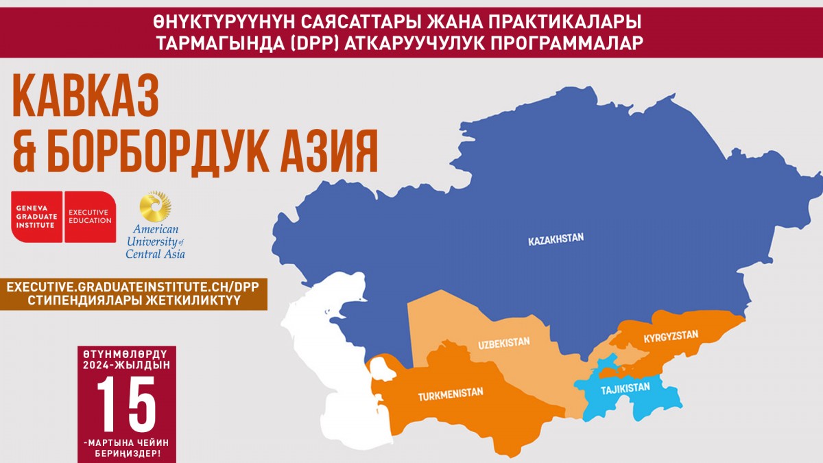 Кыргызстан, Тажикстан, Өзбекстан, Армения, Азербайжан жана Грузиянын жарандарын Эл аралык мамилелер боюнча Женева институту тарабынан каржыланган магистрдик программага чакырабыз. Сынактын жыйынтыгында билим алуу үчүн стипендияга ээ болуу мүмкүнчүлүгү жаралат! Өнүктүрүүнүн саясаттары жана практикалары боюнча Аткаруучулук программага өтүнмөлөрдү бериңиздер https://www.graduateinstitute.ch/dpp.