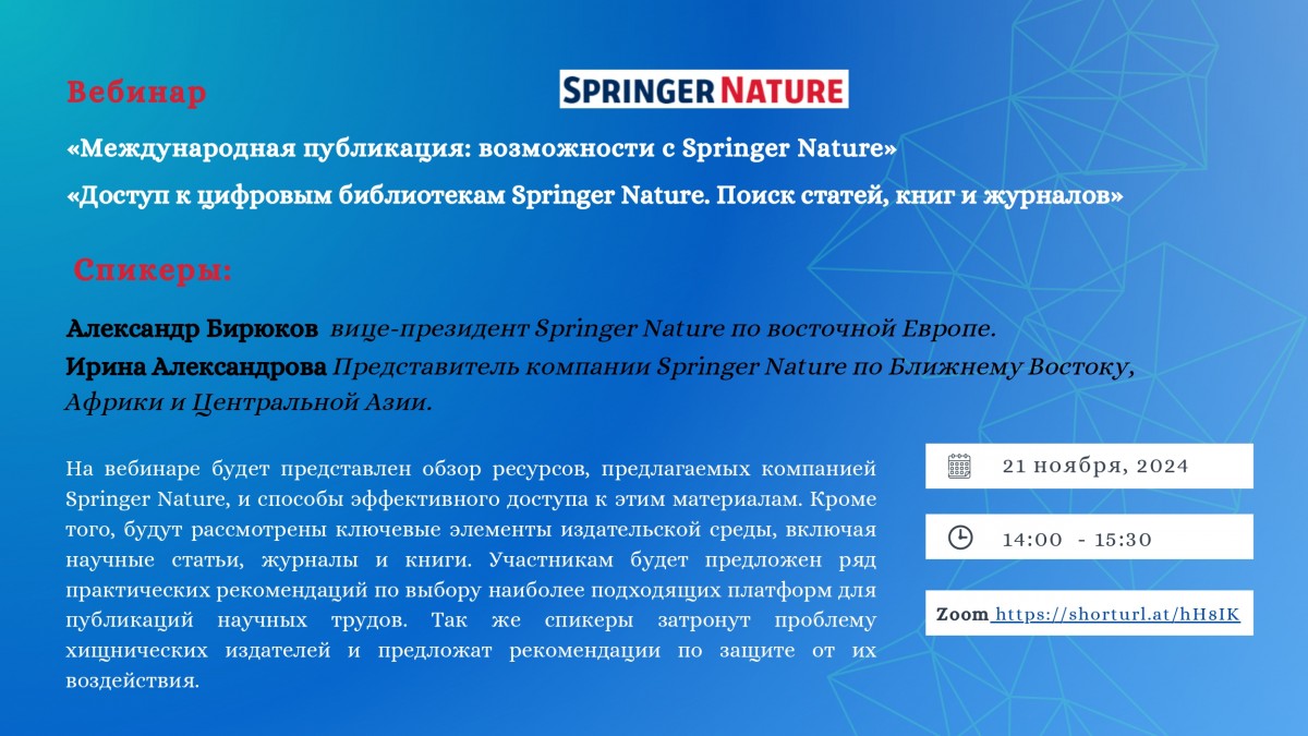 Вебинарда илимий макалалар, басылмалар жана китептерди камтыган басып чыгаруучулук чөйрөсүнүн маанилүү элементтери каралат. Катышуучуларга илимий эмгектерди жарыялоонун ыңгайлуу платформаларын тандоо боюнча бир катар практикалык сунуштамалар берилет. Спикерлер таштанды басылмалардын көйгөйлөрүн козгоп, алардын таасиринен коргонуу үчүн сунуштарын айтышат. Ошондой эле Springer Nature компаниясынын ресурстары тууралуу баяндама жасалып, анын материалдарын эффективдүү пайдалануу жолдору көрсөтүлөт.