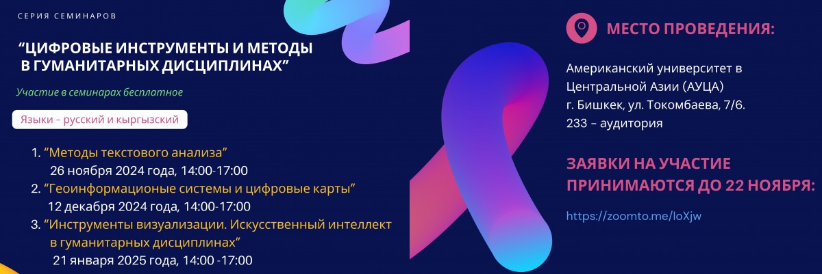БААУда Президенттик Фонддун PREF колдоосу астында Кыргызстандын жергиликтүү ЖОЖдорунун окутуучулары, аспиранттары жана изилдөөчүлөрү үчүн семинарлардын сериясы өткөрүлөт. Семинарлардын темасы: “Гуманитардык илимдердеги санариптик куралдар жана усулдар”