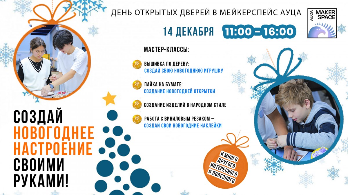 Эртең, 14-декабрда БААУнун Мейкерспейсинде жаңы жылдык Ачык эшиктер күнү өткөрүлөт. Анын программасында майрамдык маанайдагы өзгөчө мастер-класстар каралган: