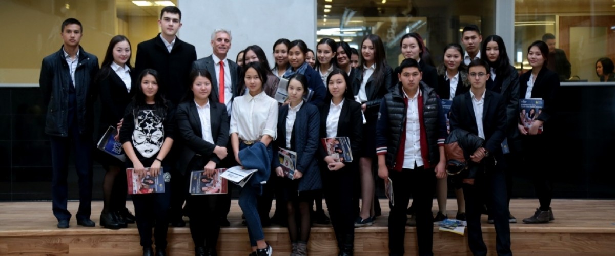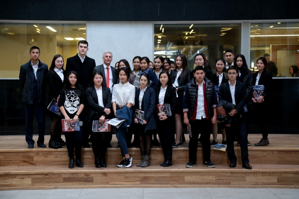 Президент АУЦА Эндрю Вахтель провел для школьников небольшую лекцию, во время которой подробно рассказал о программах обучения, финансовой поддержке, оказываемой большинству студентов, об Академии Нового Поколения (АНП), о трудоустройстве выпускников, и многом другом.