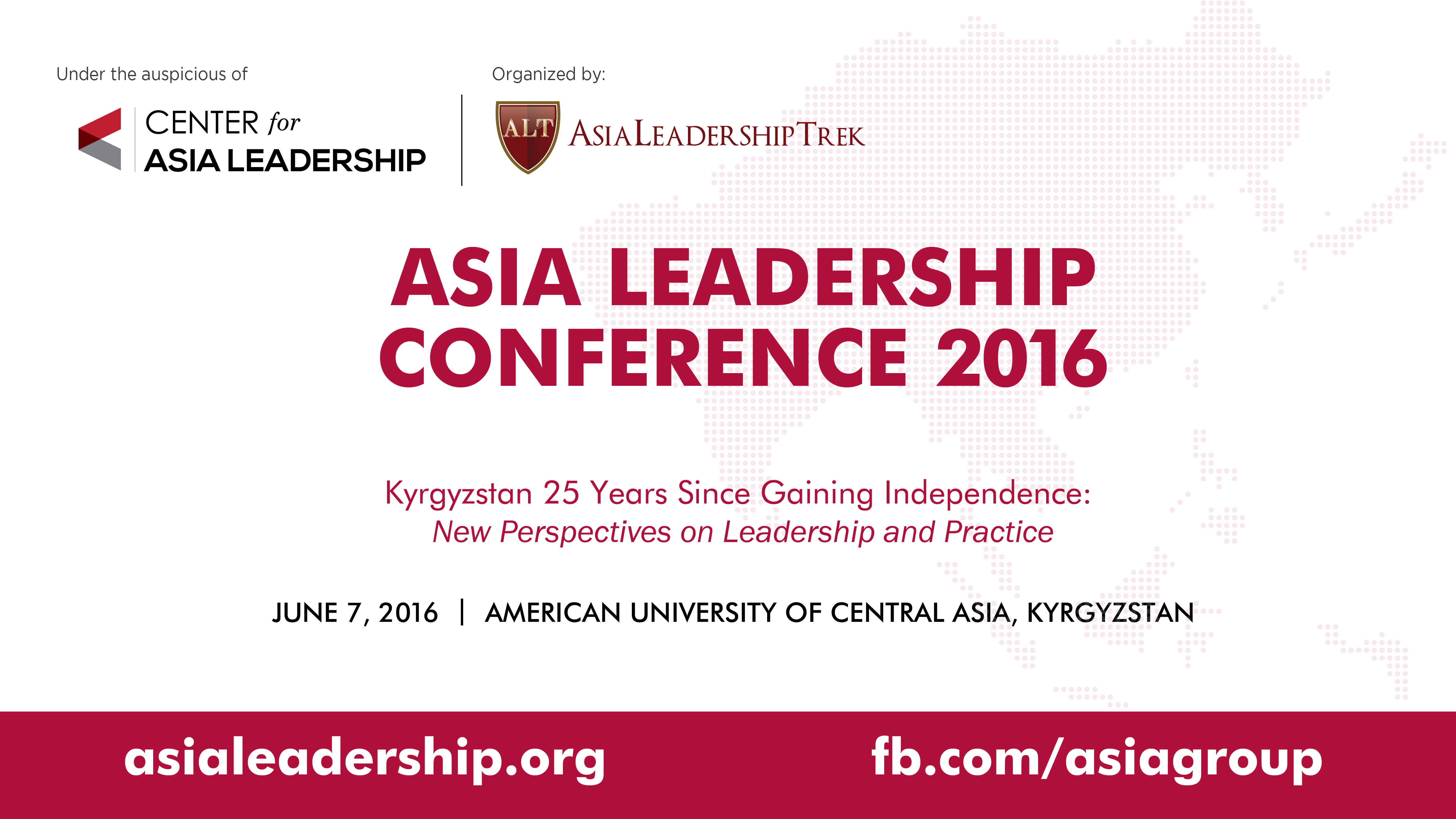 Тема конференции: «Двадцать пять лет со дня приобретения независимости Кыргызстана: Новые перспективы лидерства и практики». Конференция пройдёт 7 июня 2016 года, с 9:00 до 17:00, в Американском университете в Центральной Азии (АУЦА), в городе Бишкек.