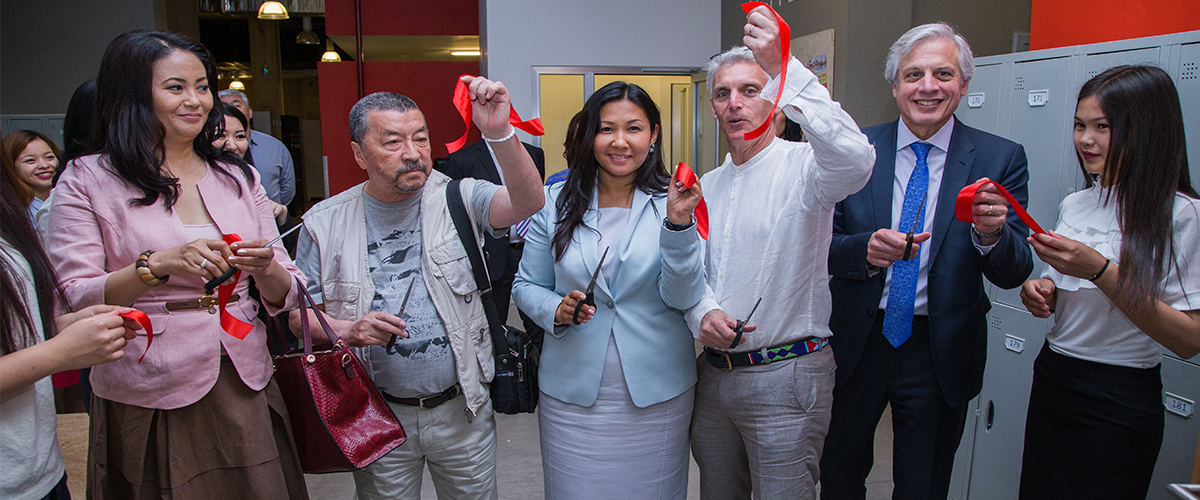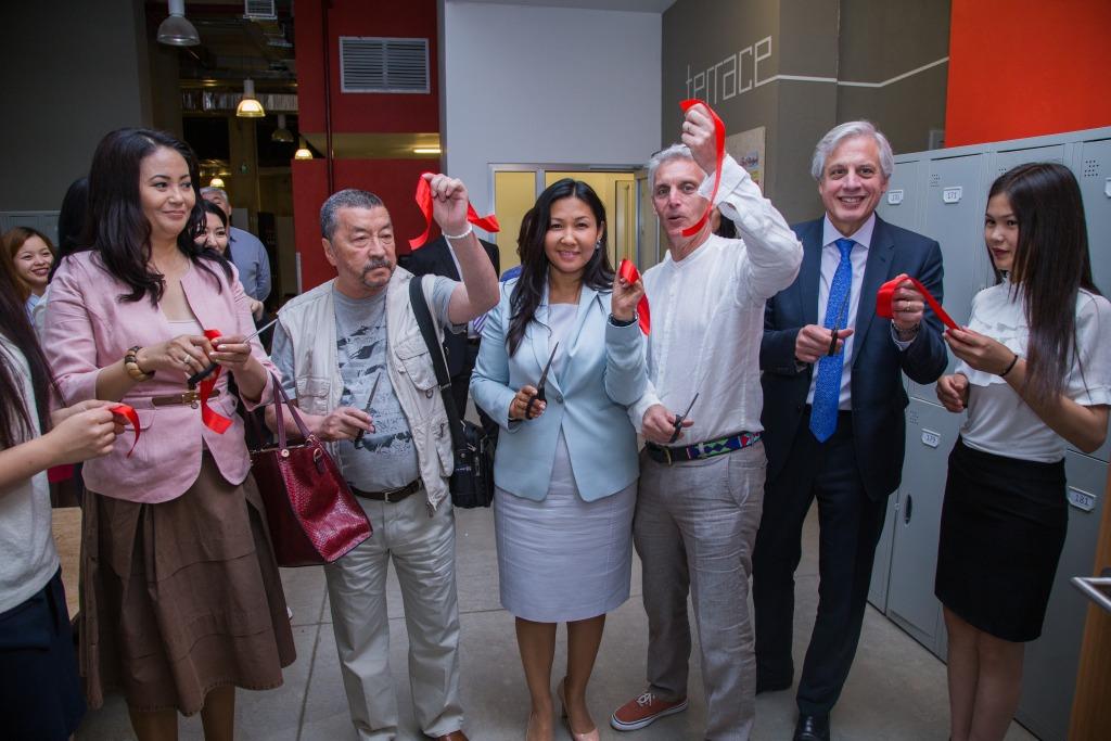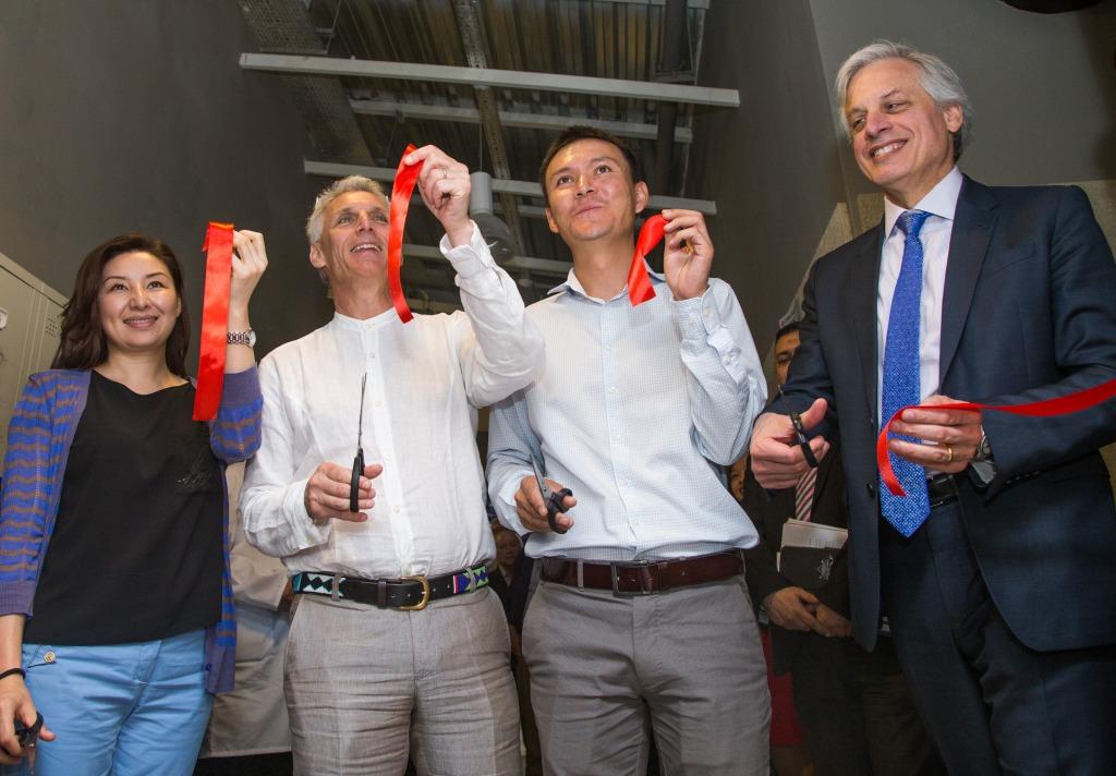 Красную ленточку разрезали сразу несколько человек – президент АУЦА Эндрю Вахтель, глава Совета попечителей АУЦА Дэвид Лахдир, директор департамента по устойчивому развитию «Кумтор Голд Компани» Актилек Тунгатаров.