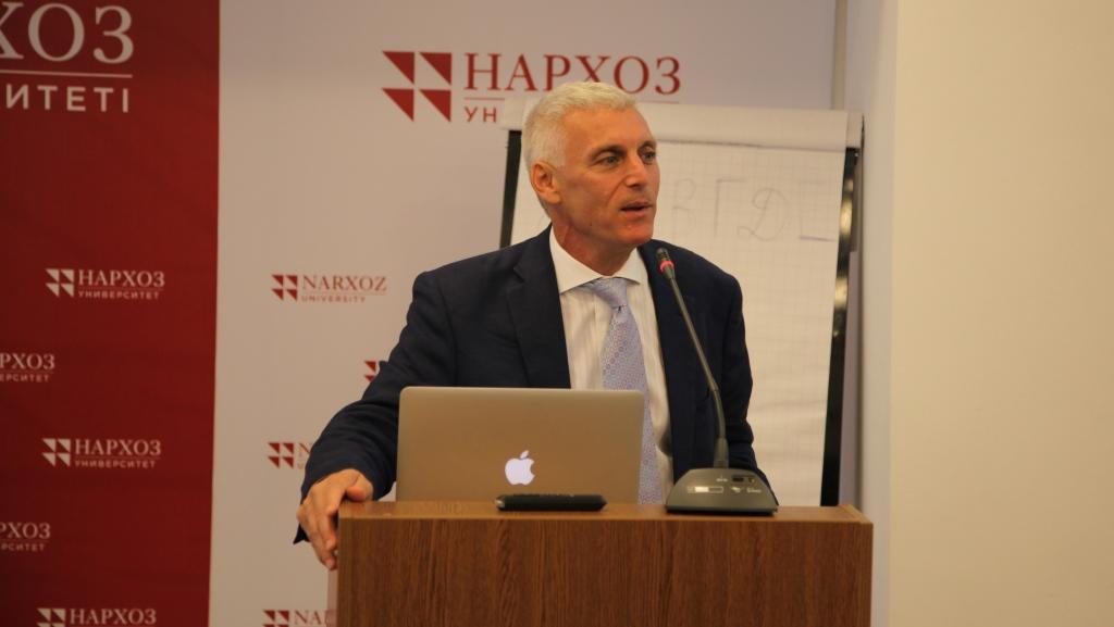 Программа мероприятия также включала лекцию Эндрю Вахтеля «Тенденции развития в сфере высшего образования в постсоветских странах». В течение 40 минут Вахтель рассказал об актуальных проблемах высшего образования и поделился опытом с коллегами из Казахстана. Слова Эндрю Вахтеля о том, что сейчас, когда есть Интернет, с помощью которого человек может найти любую информацию, неприемлемо просто передавать знания, как это было в СССР, что нужно учить студентов совершенно по-другому, заставили задуматься и задать вопросы гостю многих профессоров из Казахстана. Послушать лекцию пришли преподаватели не только университета Нархоз, но и других учебных заведений города Алматы, они изъявили также желание посетить АУЦА.