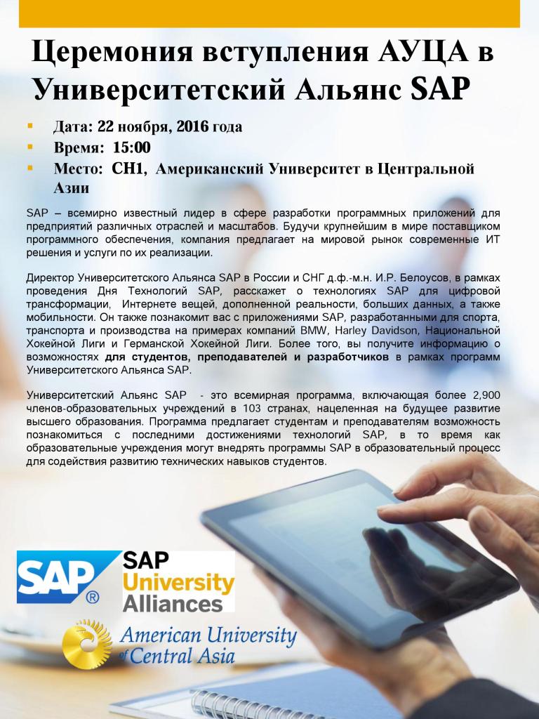 22 ноября 2016 года, Американский Университет в Центральной Азии (АУЦА) и компания SAP, лидер на рынке корпоративных приложений, впервые в Кыргызстане заключат соглашение о вступлении вуза в Университетский Альянс SAP.
