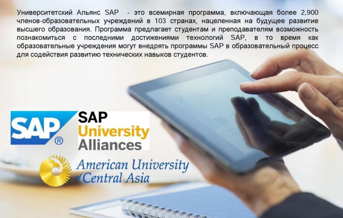 Мы рады сообщить вам, что Американский Университет в Центральной Азии (АУЦА) получил уникальную возможность стать первым в Центральной Азии ассоциированным членом Университетского Альянса SAP (http://go.sap.com/training-certification/university-alliances.html).