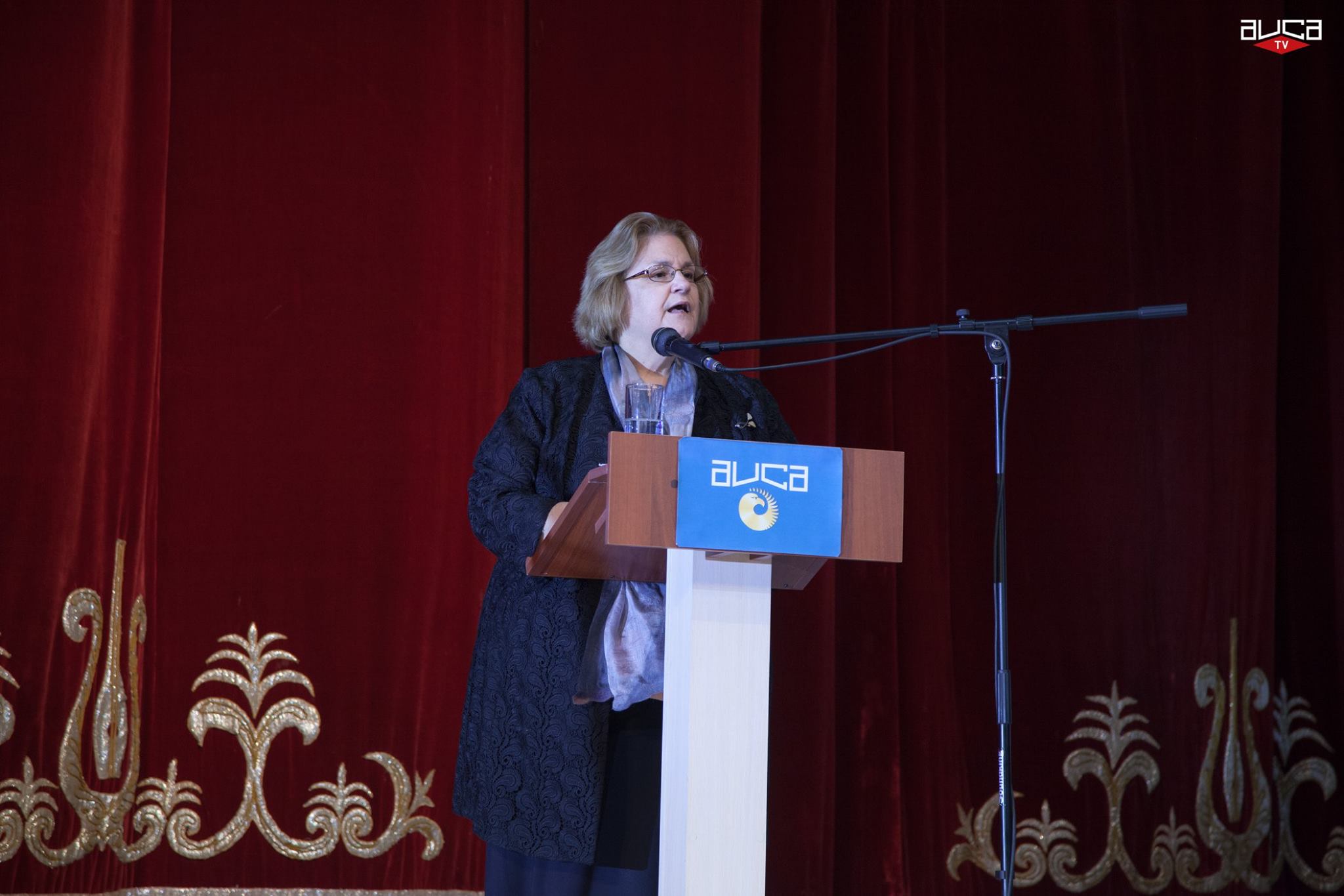 «США и Кыргызстан отмечают 25-летие дипломатических отношений и АУЦА, как монумент богатой истории между нашими странами. Здесь, в АУЦА лучшие умы в Центральной Азии образуют сообщество. В этом университете вы учитесь задавать правильные вопросы, которые помогают вам изучить окружающий мир»,- обратилась к студентам Шейла Гуолтни, посол США в Кыргызстане.