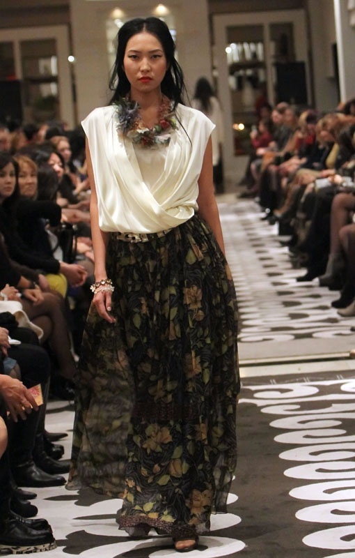 Мы попытались пофантазировать и представить себе, как выглядела та девушка. Мы ведь даже не знаем, к какому историческому периоду могла относиться жизнь этого городища. Но совершенно отчетливо нам рисуются бескрайние долины маков и лаванды, щедрые сады абрикоса, яблок и смородины. А вдали мирно пасутся живописные кони, яки и овцы. Именно эта пасторальная картинка стала основой для первого блока коллекции – «Легенда о затерянном городе». Шелковые платья в пол скромных девичьих фасонов богато принтованы растительным орнаментом и поддержаны вышивкой в тон принтам – тюльпанами, розами и маками. Помимо шелка, активную роль берет на себя наша любимая органза – платья из этой ткани идеально держат форму и объем. В категории must-have выступают жакеты и пальто, подобранные к платьям – стеганые, богато расшитые вышивкой, инкрустированные кристаллами Swarovski. Символом группы верхней одежды в этом блоке стала белая лошадь – ее вышивка красуется на лацканах пиджаков и жакетов, на подоле пальто.