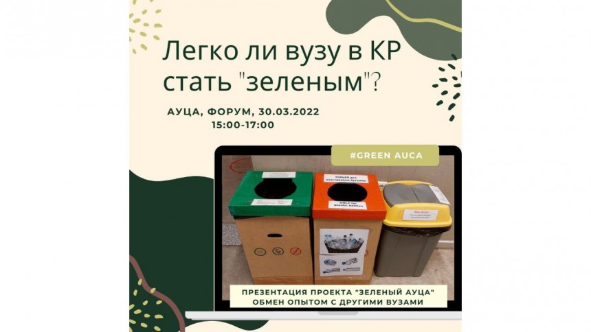 Центр изучения окружающей среды и развития (ЦОР) и Центр гражданской активности (ЦГА) АУЦА приглашаю студентов, преподавателей и сотрудников на дискуссионное мероприятие «Легко ли вузу в Кыргызстане стать “зеленым”?». В мероприятии примут участие представители других вузов КР и один из переработчиков отходов - ОсОО «Эко комплекс», которым мы планируем сдать батарейки и электронные отходы.