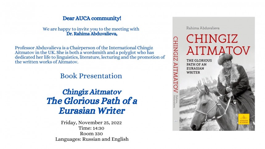 Приглашаем Вас на встречу с профессором Рахимой Абдувалиевой, которая представит свою книгу "Chingiz Aitmatov The Glorious Path of a Eurasian Writer".