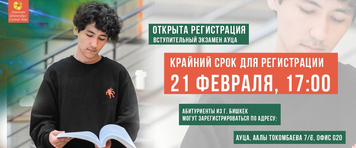 Абитуриенты, находящиеся в Бишкеке, могут зарегистрироваться по адресу: АУЦА, Аалы Токомбаева 7/6, офис G20.