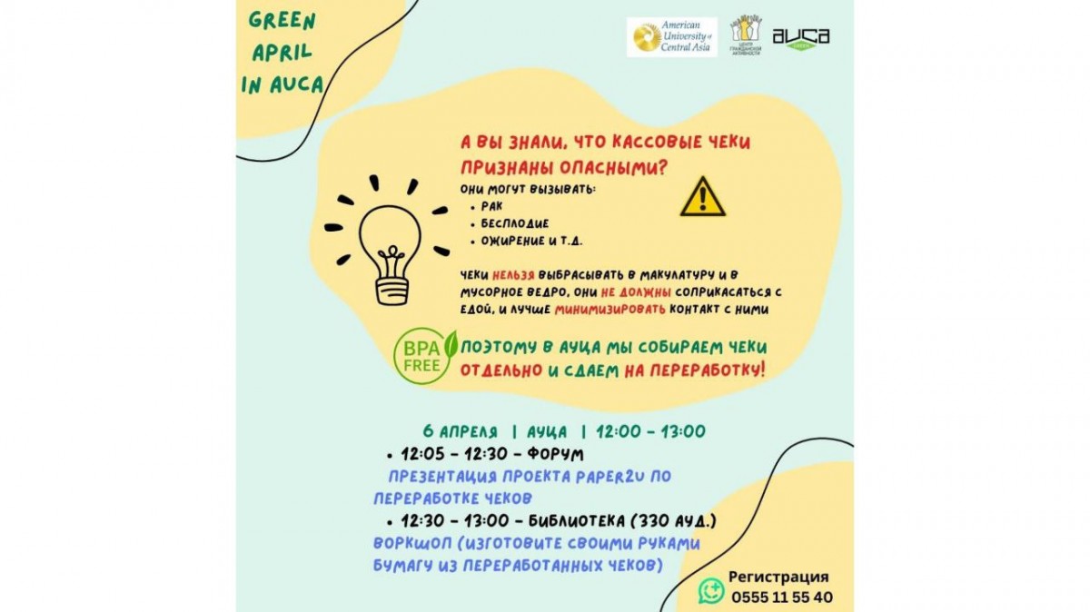 В АУЦА пришел Зеленый апрель! В течение месяца будут проходить интересные экологические мероприятия – воркшопы, фестиваль по управлению отходами 6R Fest, экотуры, субботник в Карагачевой роще. Мероприятия будут проходить в рамках программы Green AUCA, организатор – Центр гражданской активности АУЦА. Отслеживайте анонсы на сайте АУЦА и в соцсетях, а также в рассылках и соцсетях ЦГА.