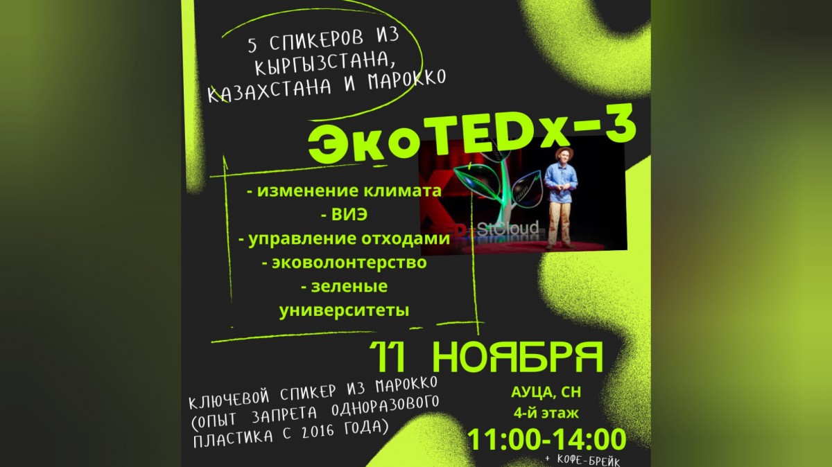 11 ноября в Американском университете в Центральной Азии пройдет 3-я по счету экологическая конференция в формате TEDx. ЭкоTEDx-3 получился международным – в мероприятии выступят 5 спикеров, причем не только из Кыргызстана, но и из Казахстана (ЕНУ им. Гумилева) и Марокко (AUI Morocco: Al Akhawayn University in Ifrane).