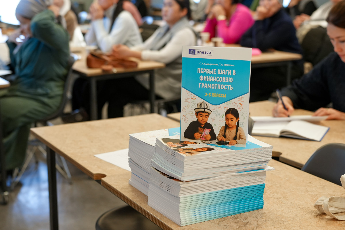 На занятии профессор факультета «Прикладная математика и информатика» Сыргак Капарович Кыдыралиев представил учебное пособие «Первые шаги в финансовую грамотность 2-5 класс», разработанное и изданное при поддержке Регионального офиса ЮНЕСКО в Алматы и Агентства по гарантии качества в сфере образования EdNet.
