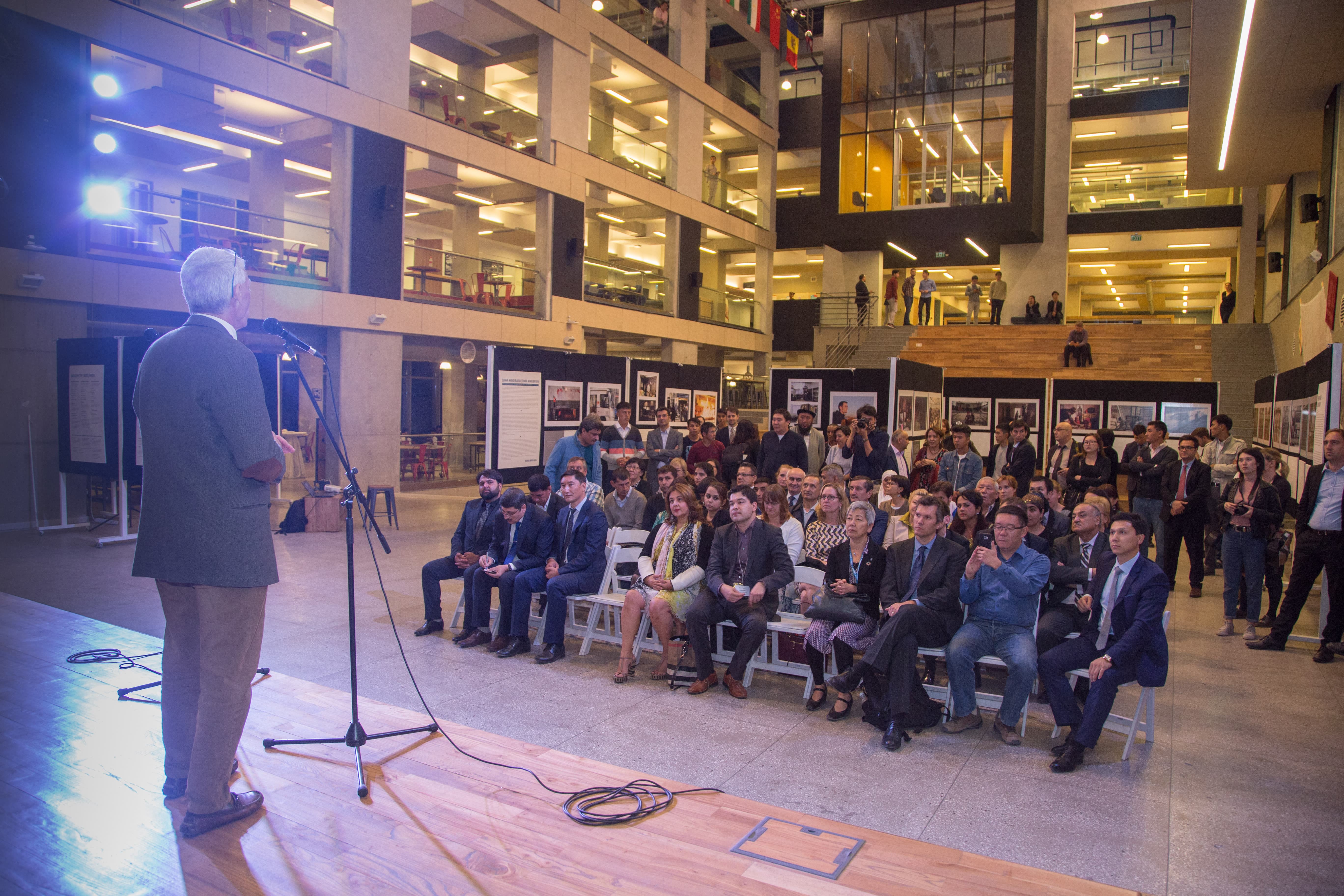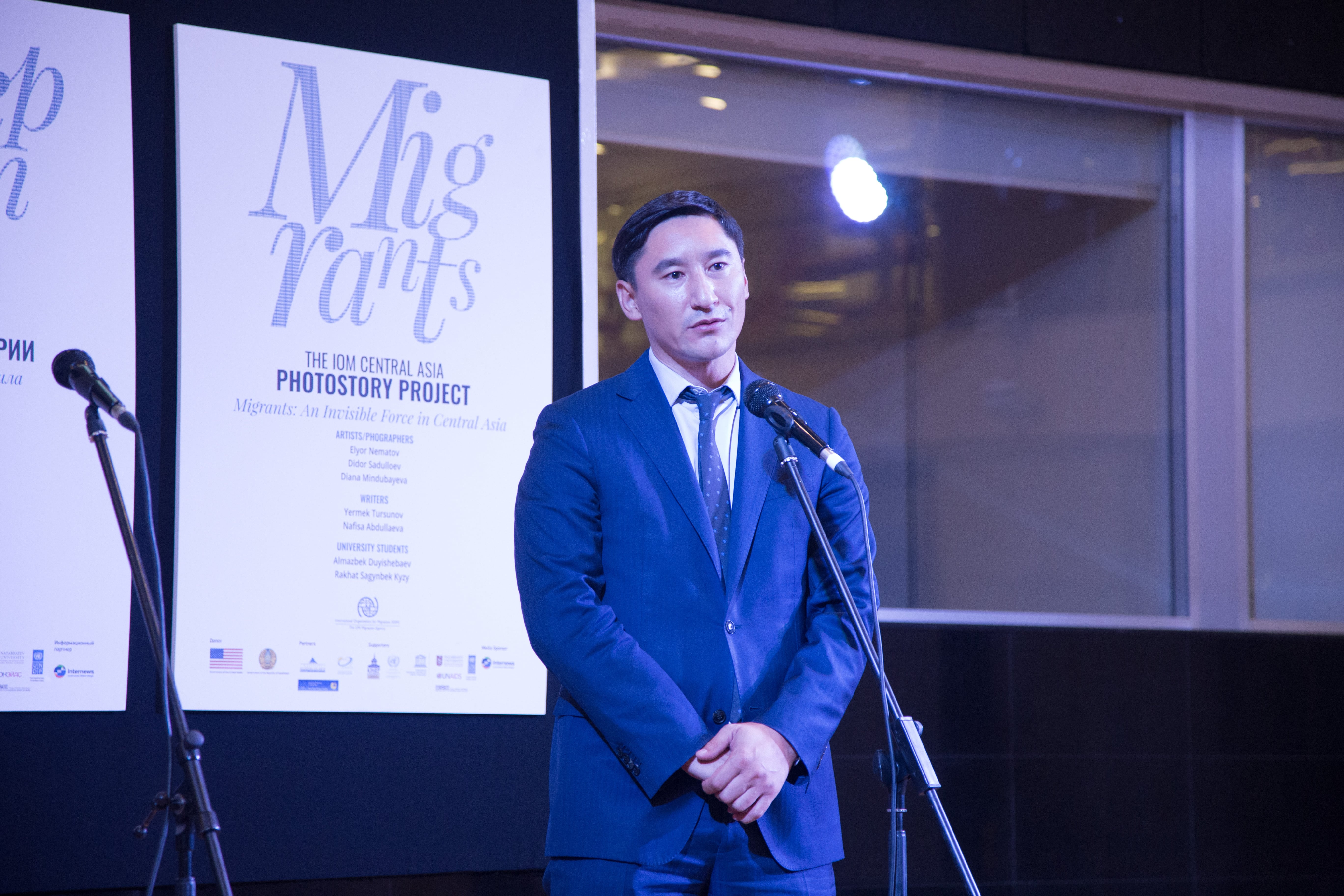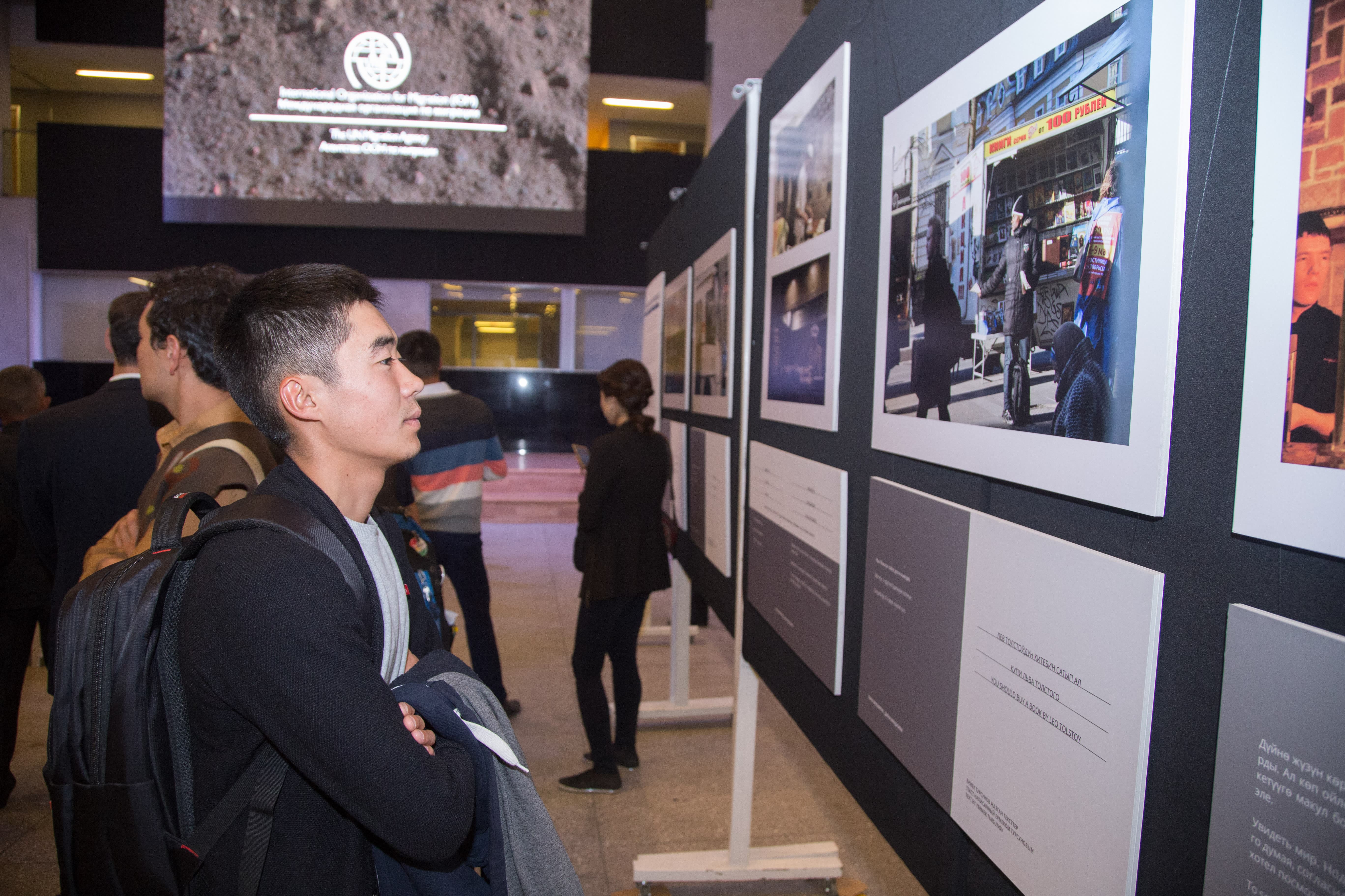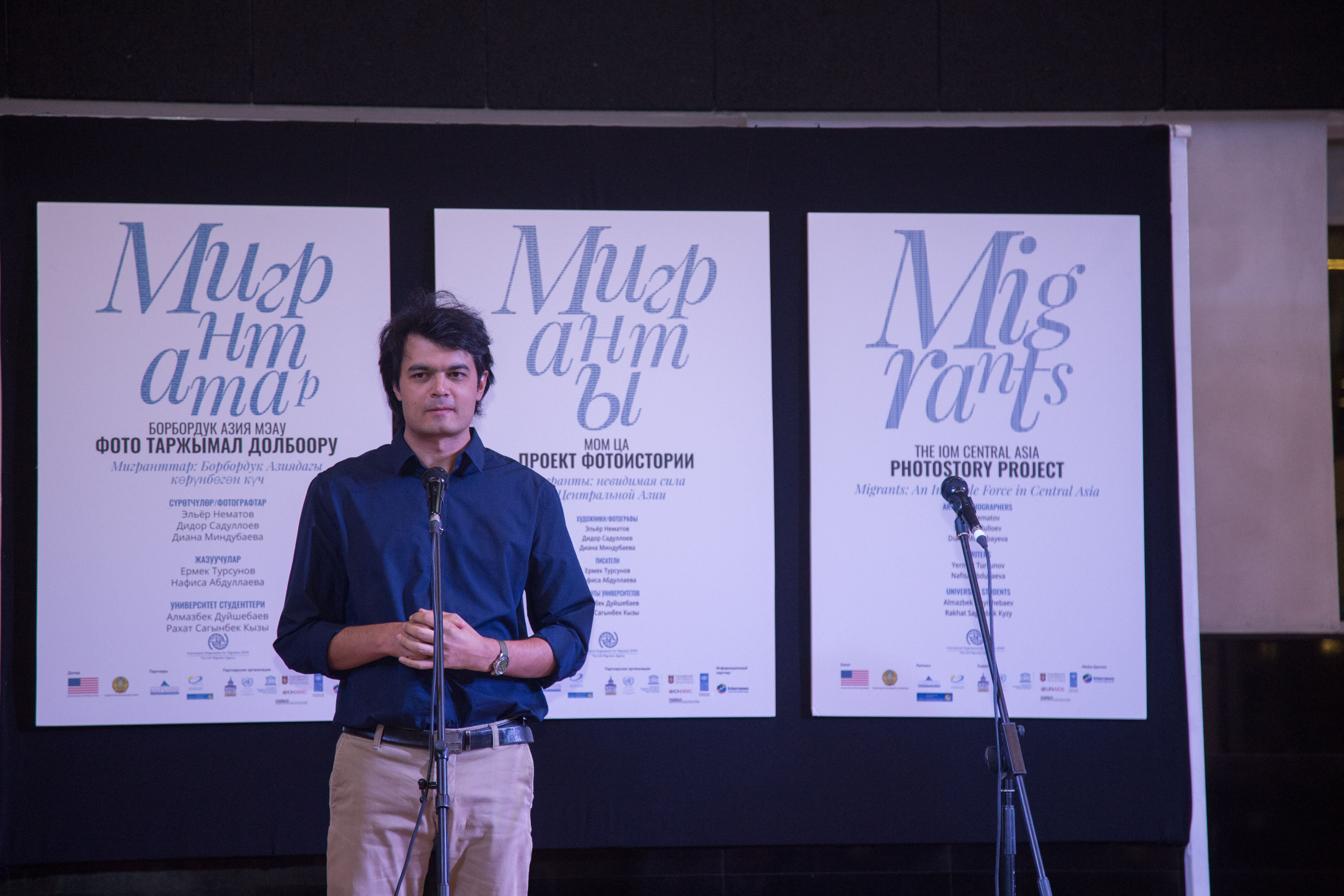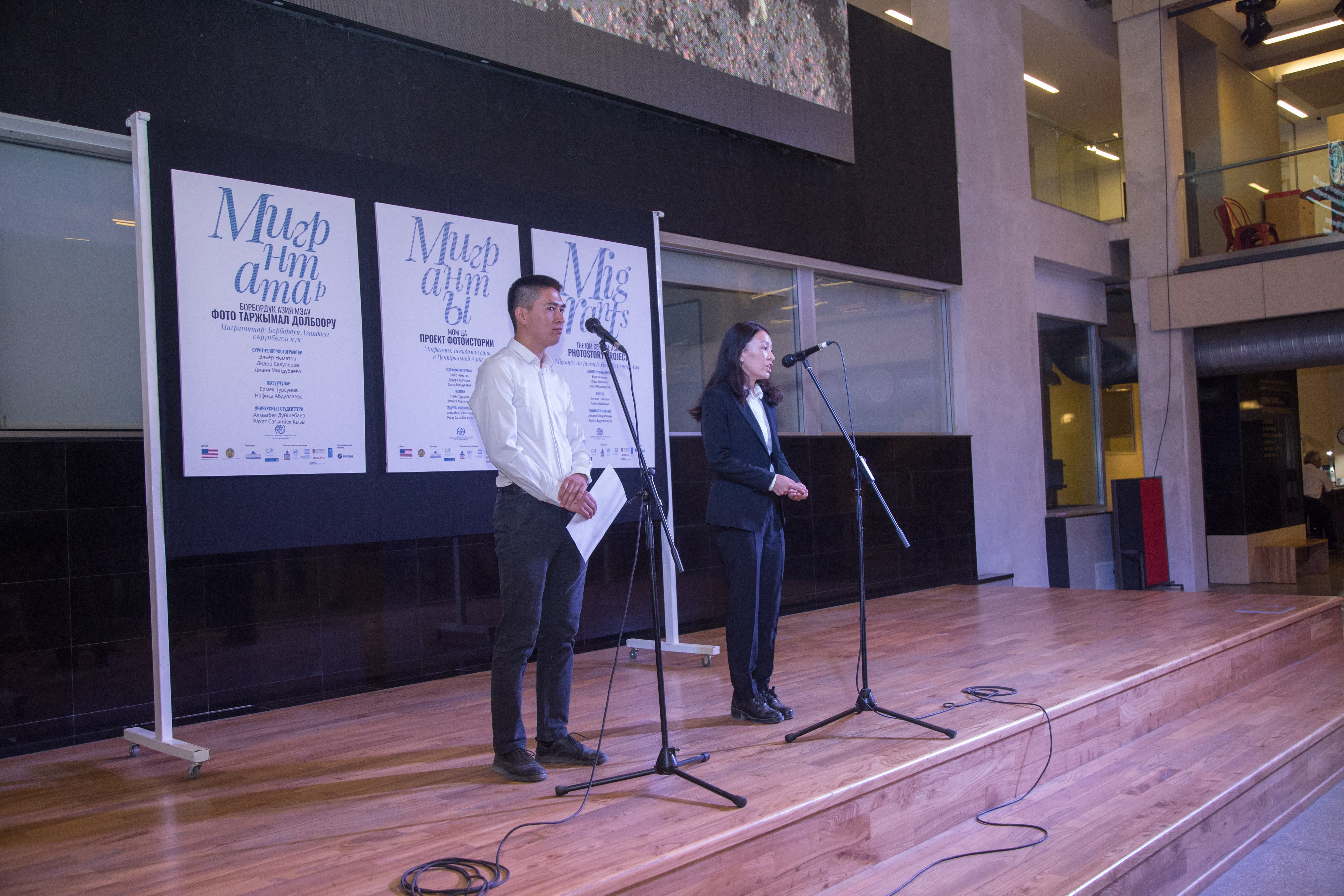 Открывали выставку президент АУЦА Эндрю Вахтель, руководитель офиса МОМ в Алматы и заместитель регионального координатора по Центральной Азии Татьяна Хаджиэммануэль, заместитель председателя Госслужбы по миграции при ПКР Алмазбек Асанбаев, представители посольств разных стран и др.